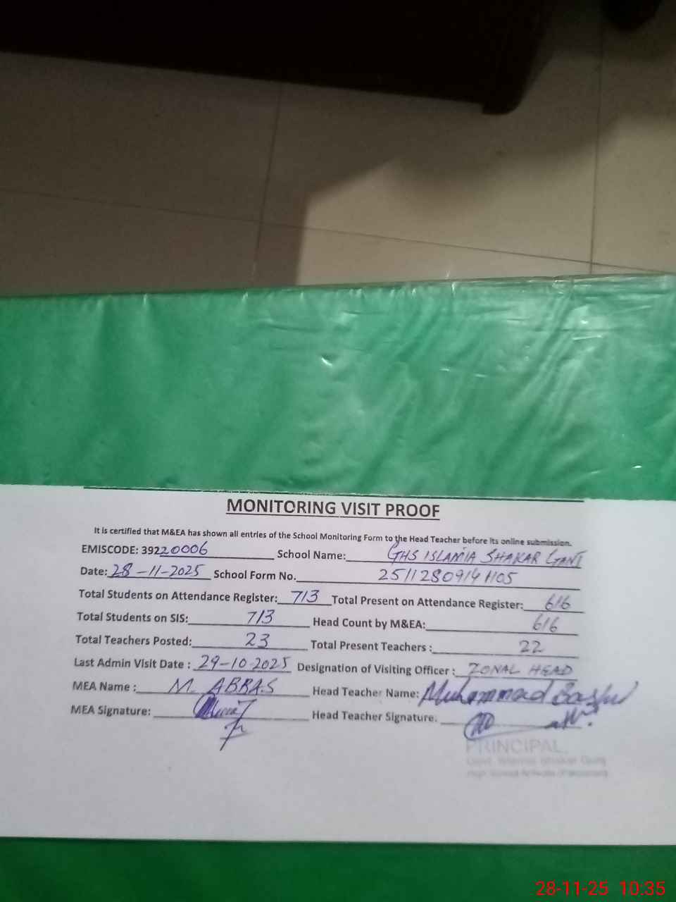 | Attendance Register | Head Teacher | MEA with School | Visit Proof |