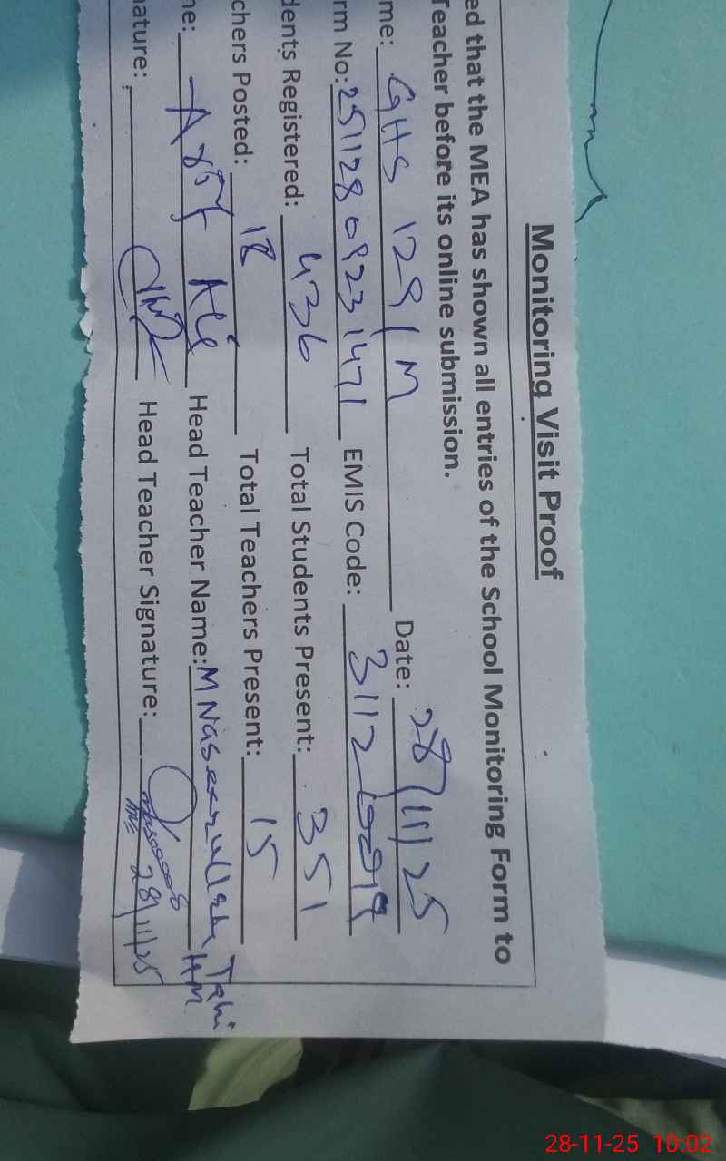 | EMIS Code: 31120019 | Name of School: GHS CHAK NO. 129/M | |||