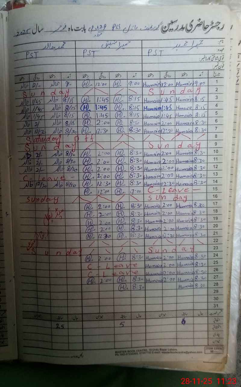 | CNIC | Full Name | Designation | R/C | Absence During Last Calender Month |