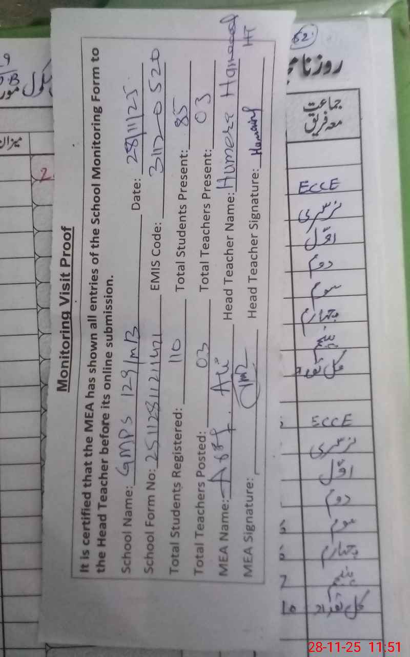 | Attendance Register | Head Teacher | MEA with School | Visit Proof |