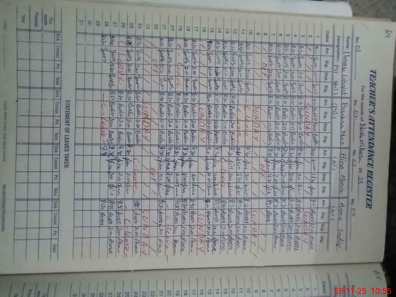 | CNIC | Full Name | Designation | R/C | Absence During Last Calender Month |