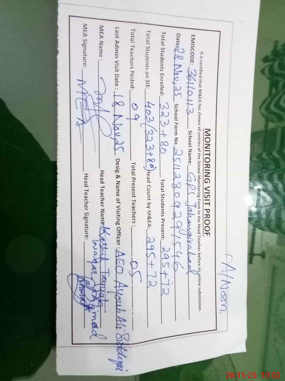 | Monitoring Date: 28-11-2025 | Start Time: 28-11-2025 09:29 AM | End Time: 28-11-2025 10:14 AM | Name of MEA: Mu**** Ma**** | |