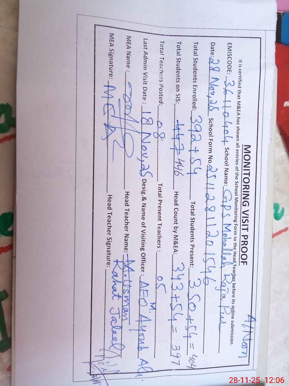 | Attendance Register | Head Teacher | MEA with School | Visit Proof |