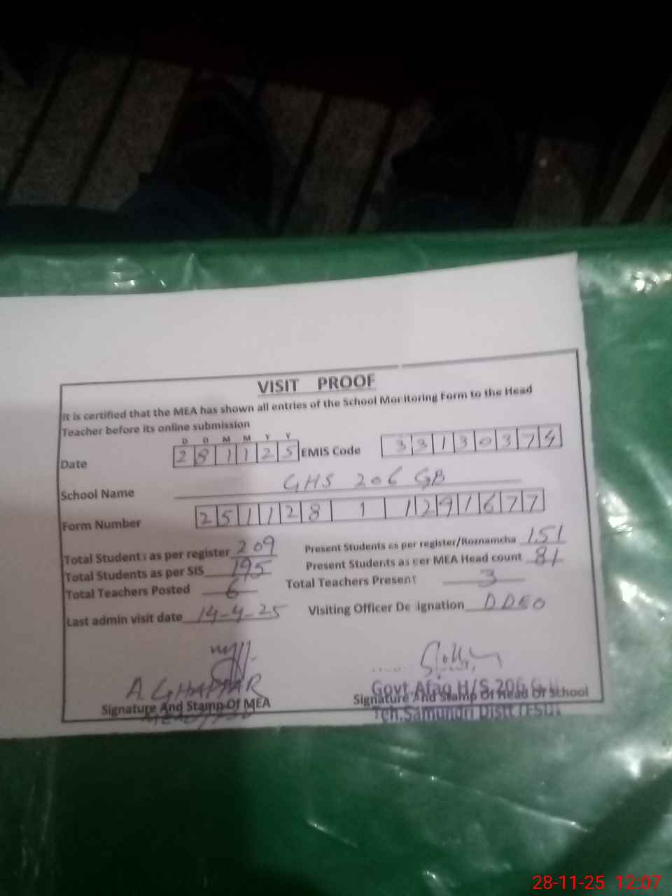 | Attendance Register | Head Teacher | MEA with School | Visit Proof |