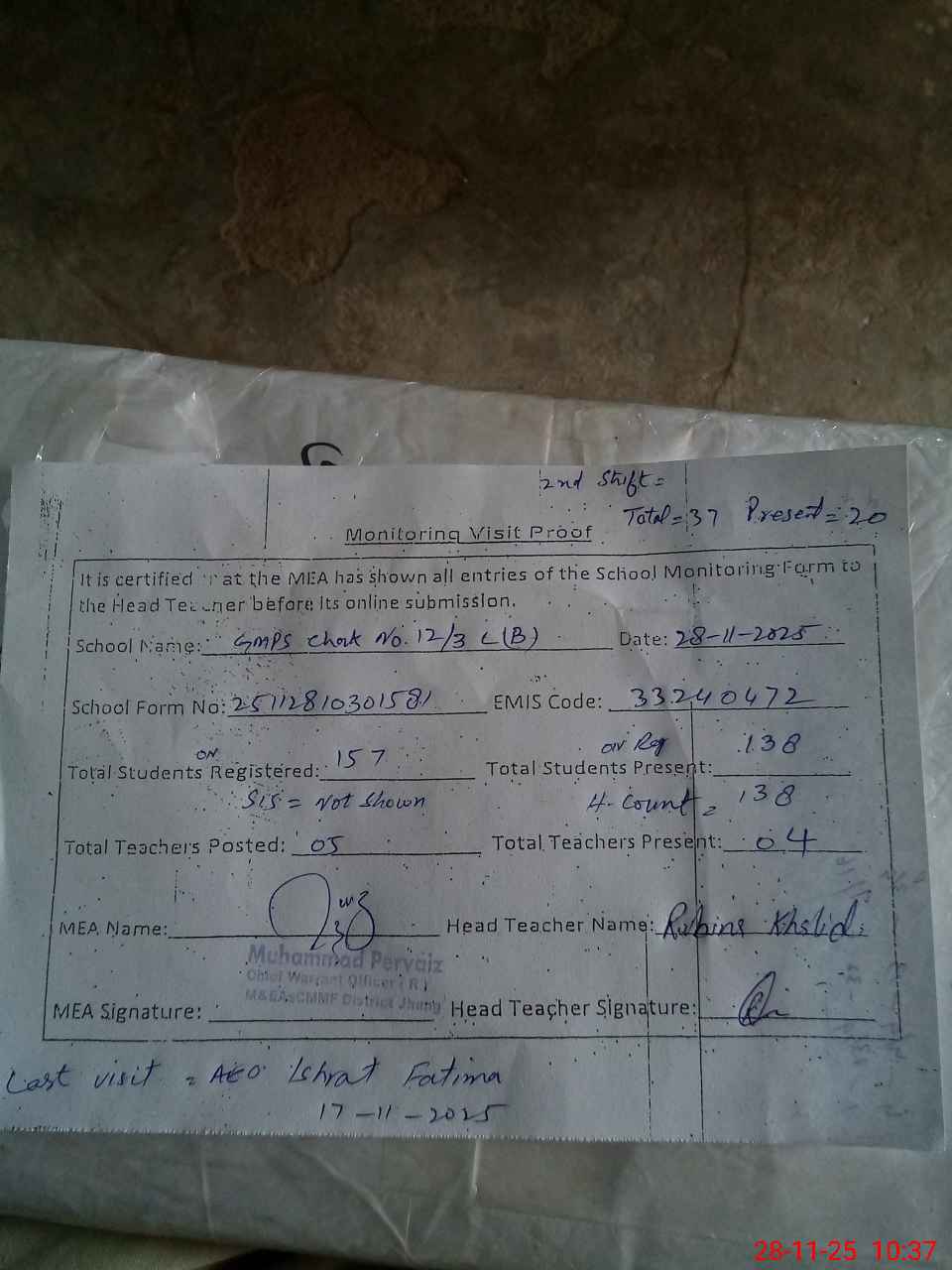 | EMIS Code: 33240472 | Name of School: GMPS CHAK NO 12/3 L (B) | |||