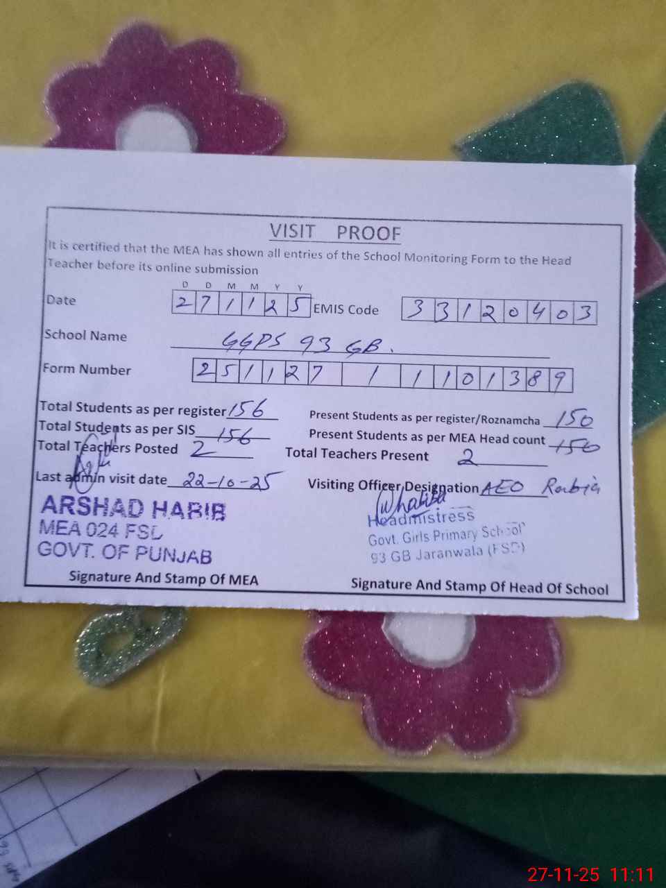 | District: FAISALABAD | Tehsil: JARANWALA | Markaz: PULL 93 GB - FEMALE | Level: Primary | |