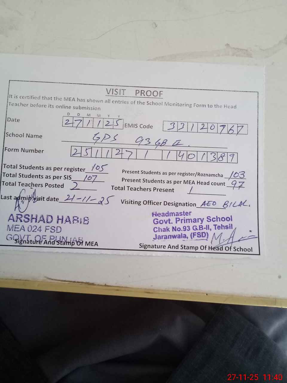 | Attendance Register | Head Teacher | MEA with School | Visit Proof |