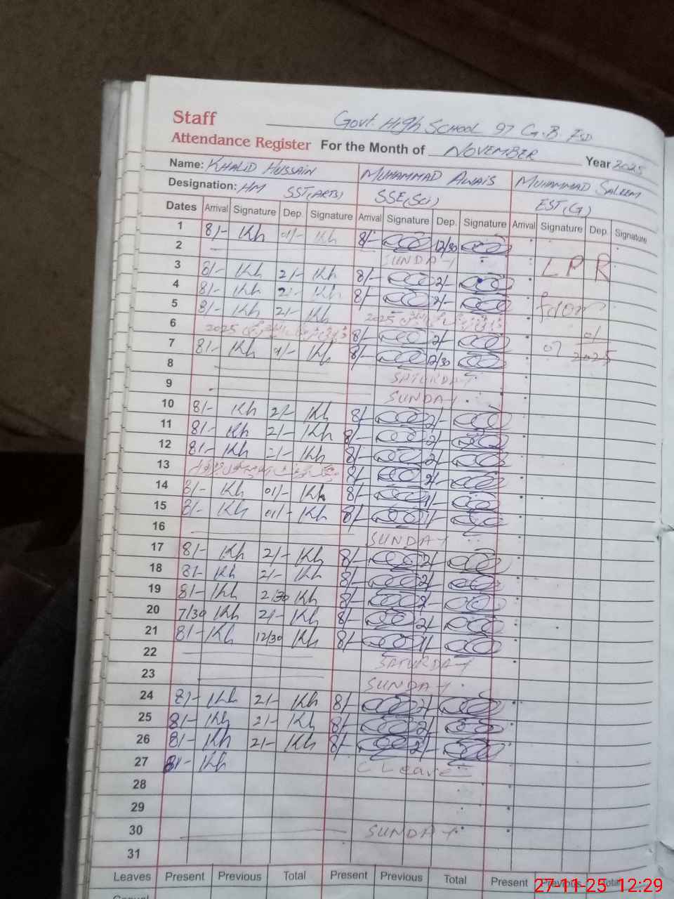 | CNIC | Full Name | Designation | R/C | Absence During Last Calender Month |