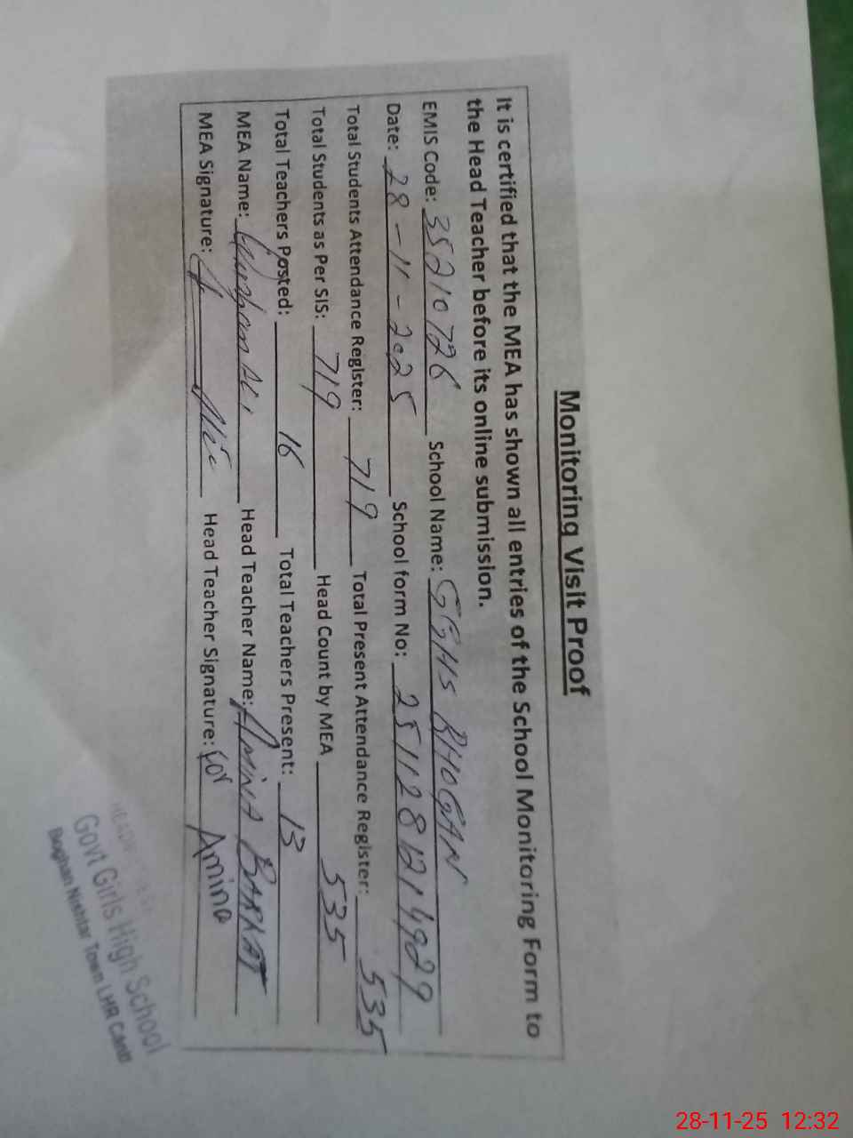 | Attendance Register | Head Teacher | MEA with School | Visit Proof |