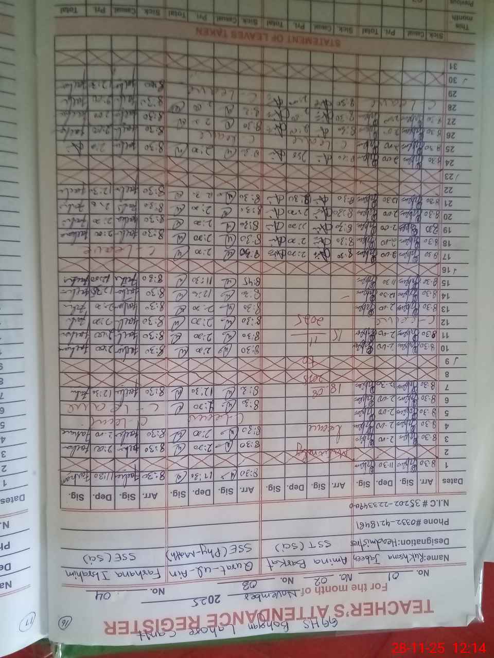| CNIC | Full Name | Designation | R/C | Absence During Last Calender Month |