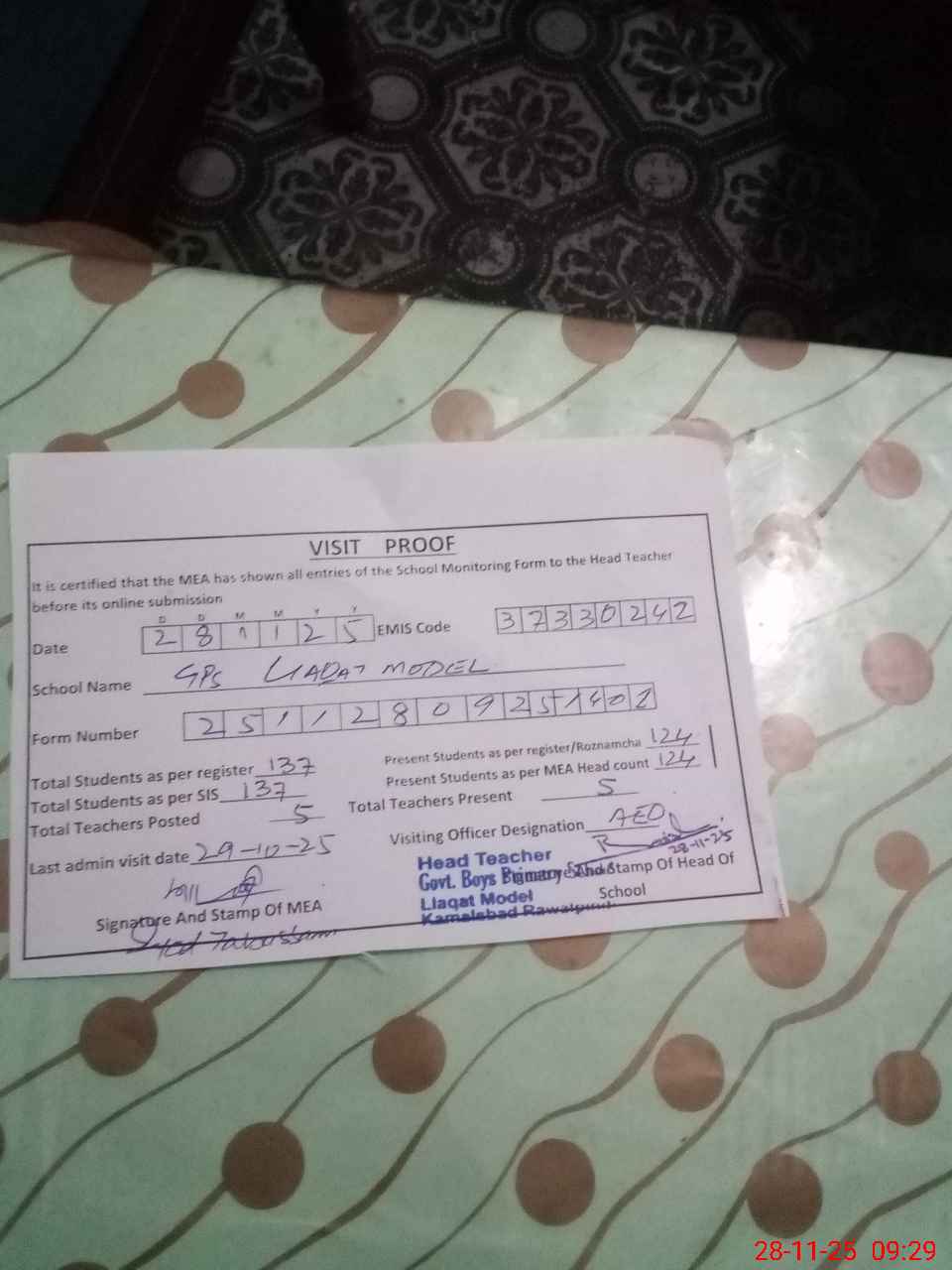 | Attendance Register | Head Teacher | MEA with School | Visit Proof |