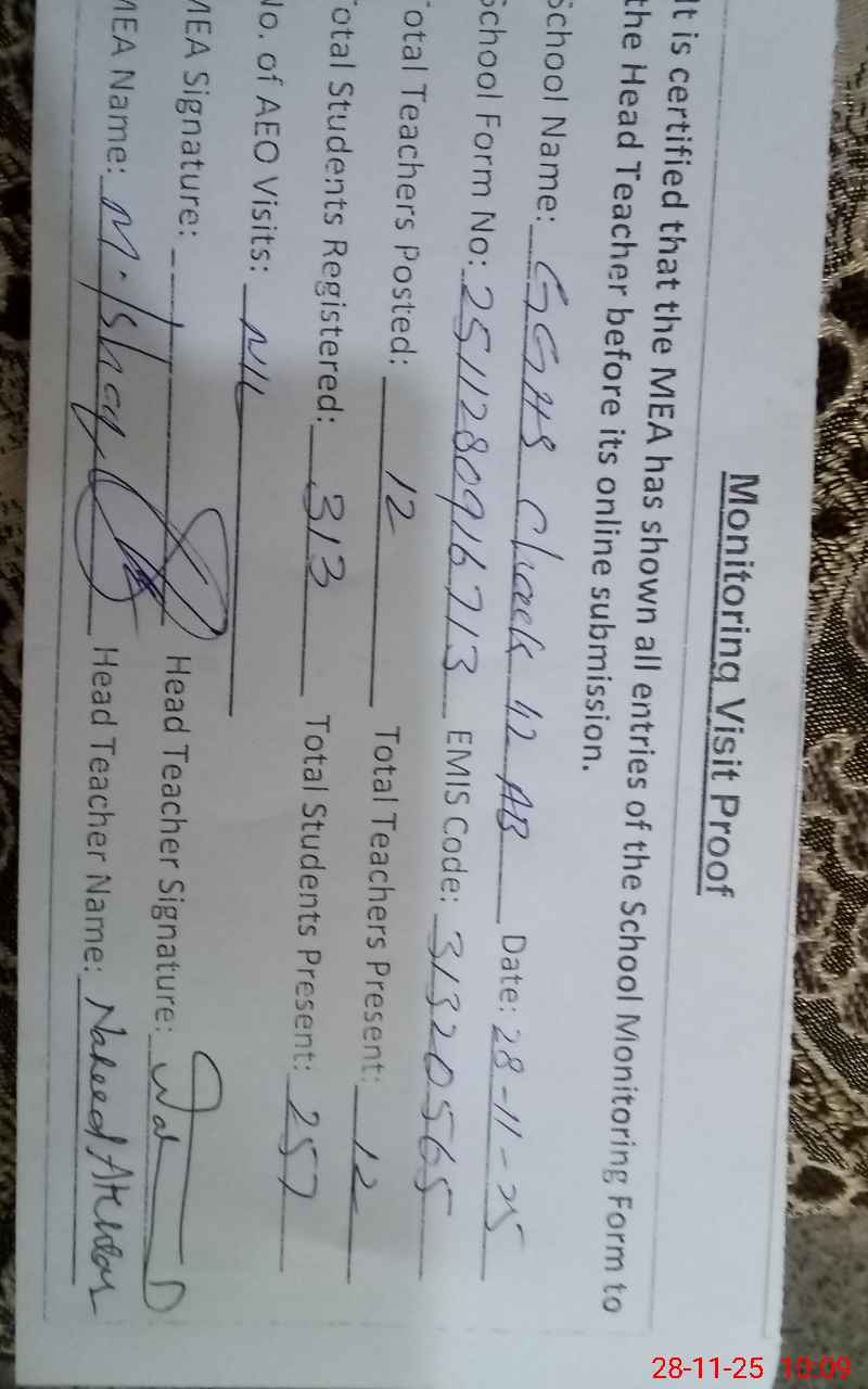 | EMIS Code: 31320565 | Name of School: GGHS CHAK 42/A | |||
