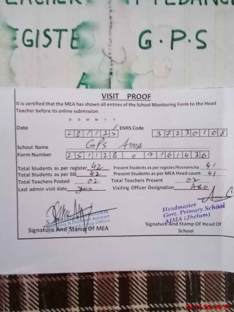 | Attendance Register | Head Teacher | MEA with School | Visit Proof |