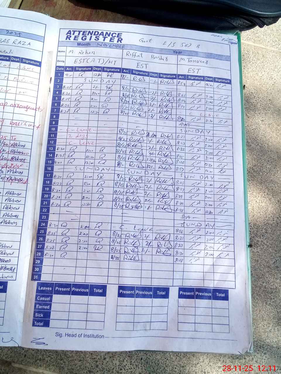 | CNIC | Full Name | Designation | R/C | Absence During Last Calender Month |