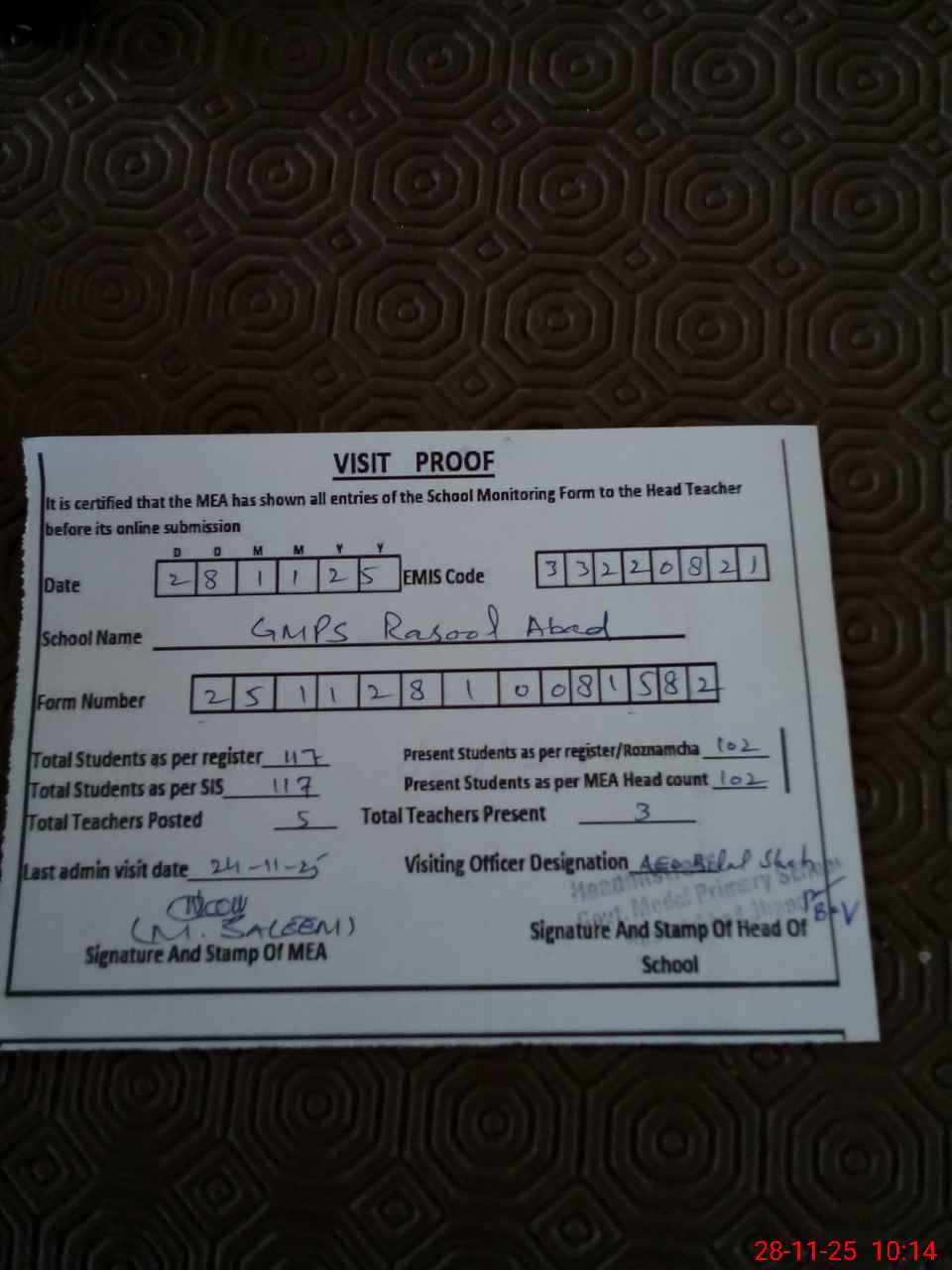 | Attendance Register | Head Teacher | MEA with School | Visit Proof |