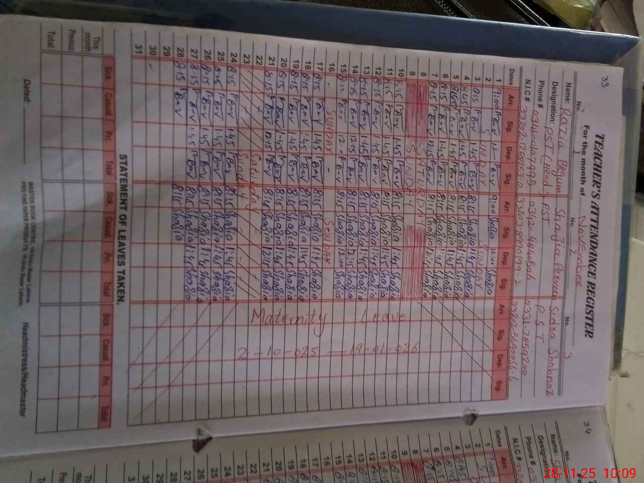 | CNIC | Full Name | Designation | R/C | Absence During Last Calender Month |