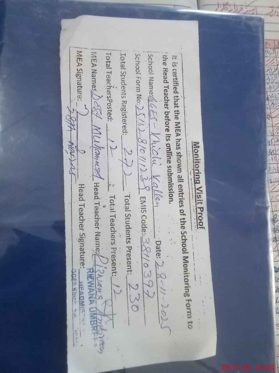 | Attendance Register | Head Teacher | MEA with School | Visit Proof |