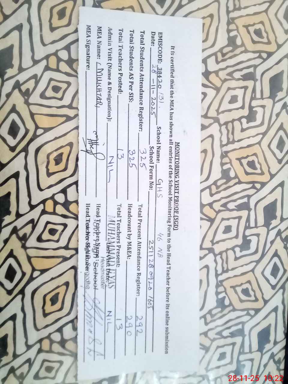 | Name: MU**** IL**** Designation: (School Headmaster's/Headmistress's) SST Phone/Cell Number: 03**** |