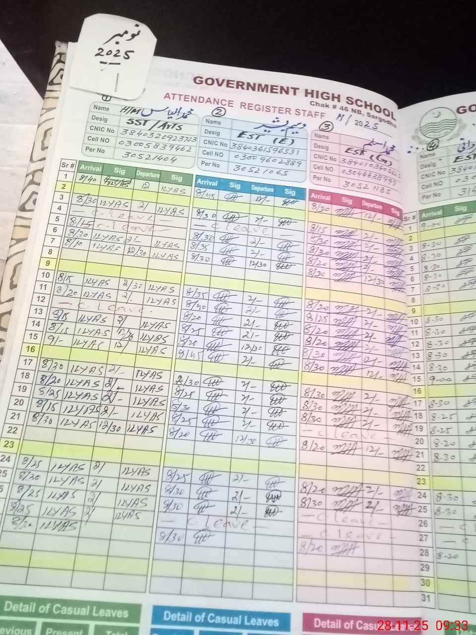 | CNIC | Full Name | Designation | R/C | Absence during last cal. month |