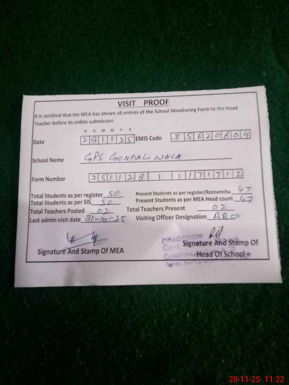 | EMIS Code: 35620604 | Name of School: GPS GONDLAWALA CHAK 20 RB | |||
