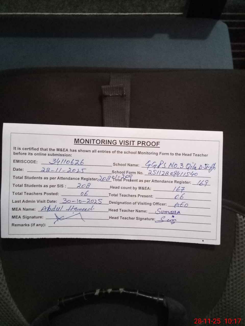 | Attendance Register | Head Teacher | MEA with School | Visit Proof |