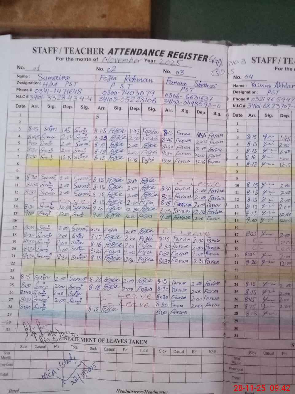 | CNIC | Full Name | Designation | R/C | Absence During Last Calender Month |