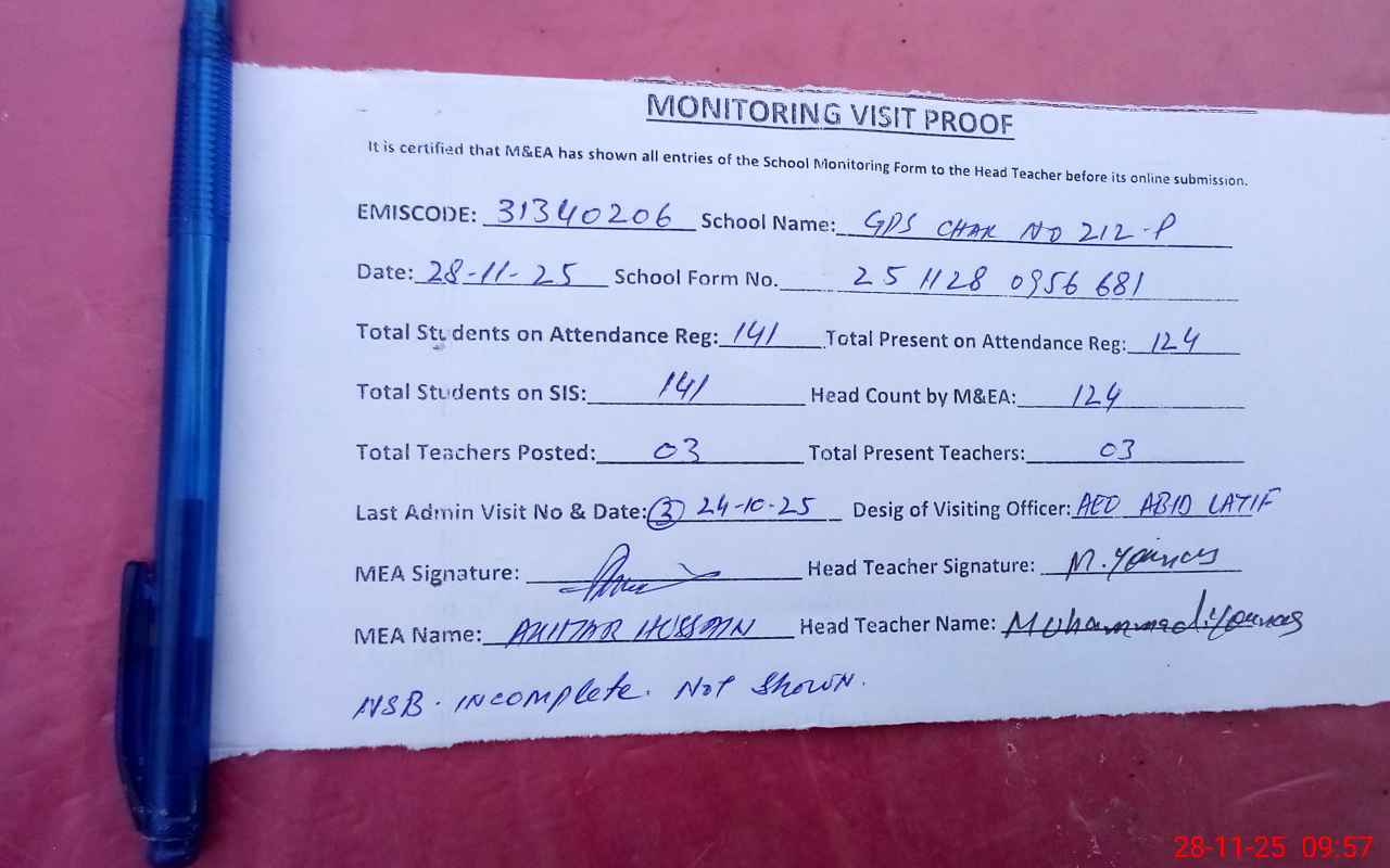 | EMIS Code: 31340206 | Name of School: GPS CHAK NO 212 P | |||