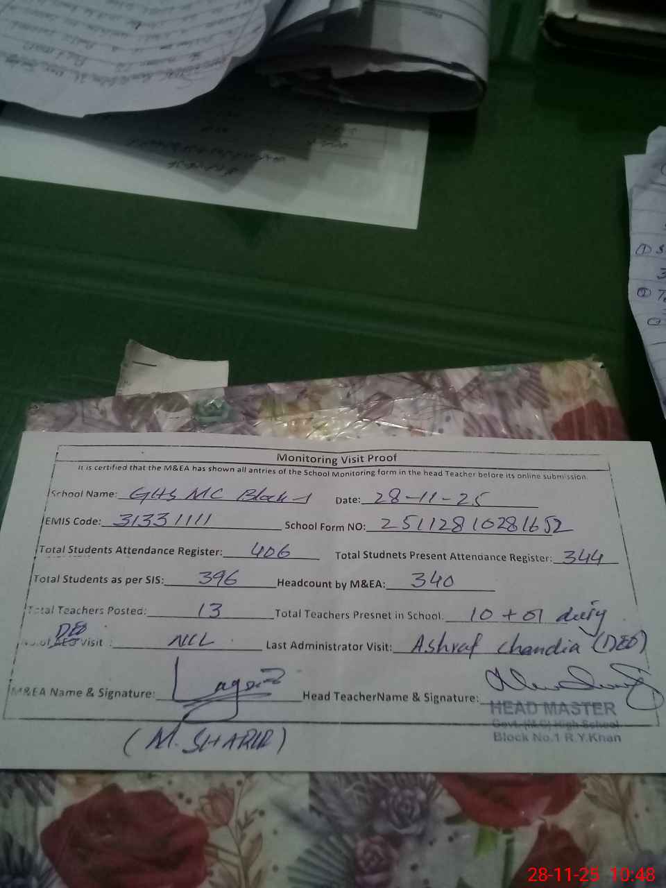 | EMIS Code: 31331111 | Name of School: GHS MC BLOCK NO. 1 | |||