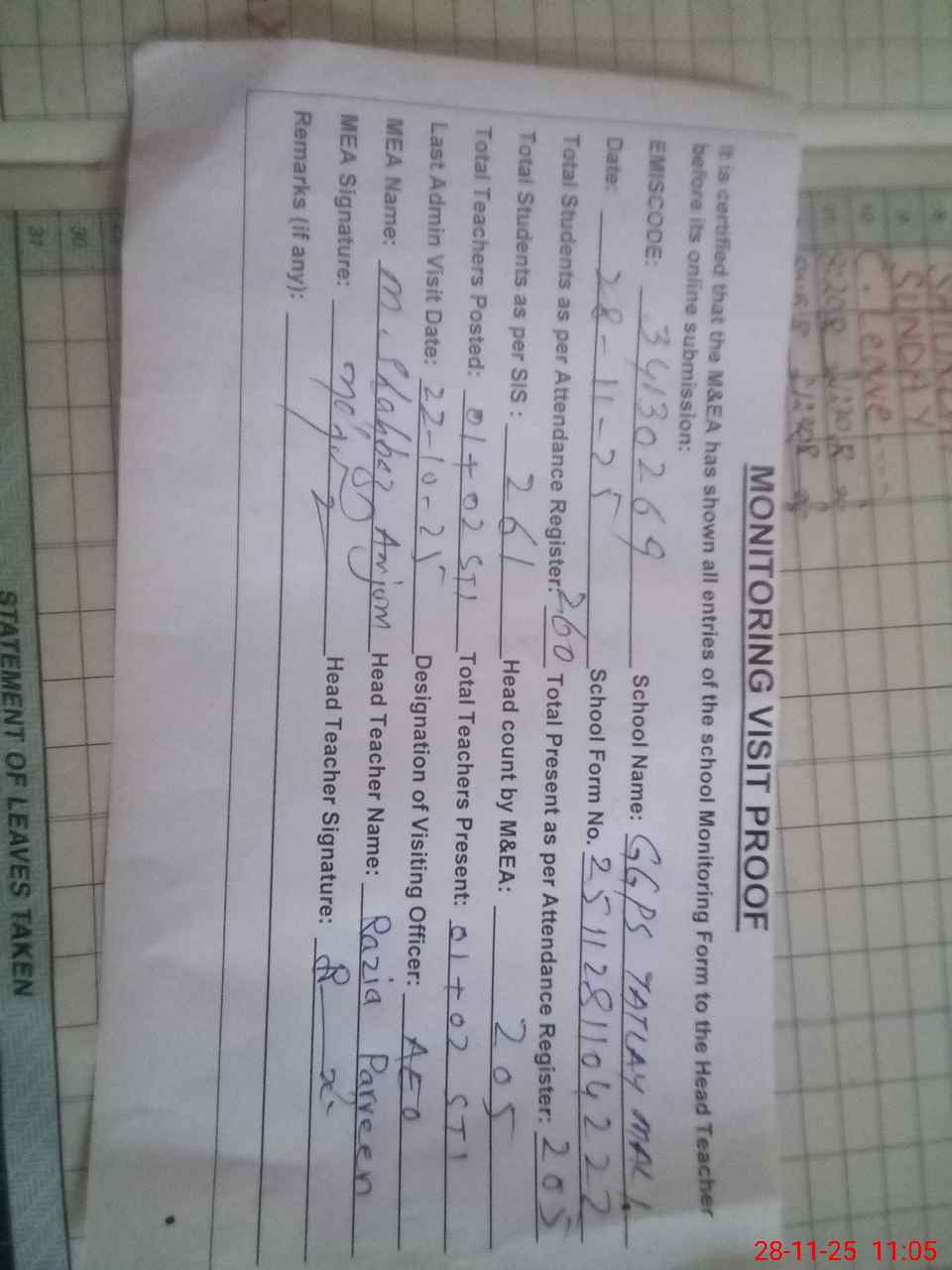 | Attendance Register | Head Teacher | MEA with School | Visit Proof |
