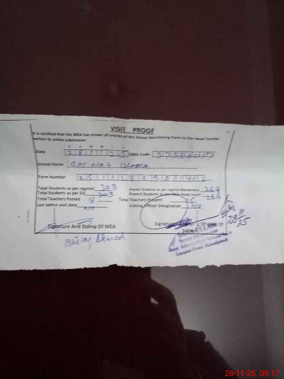 | Attendance Register | Head Teacher | MEA with School | Visit Proof |