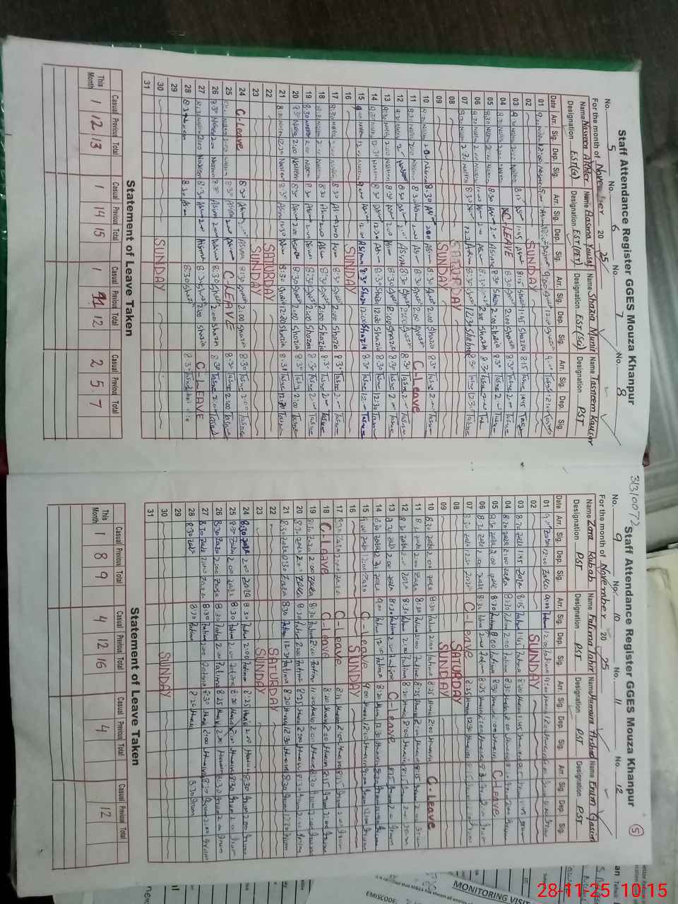 | CNIC | Full Name | Designation | R/C | Absence During Last Calender Month |