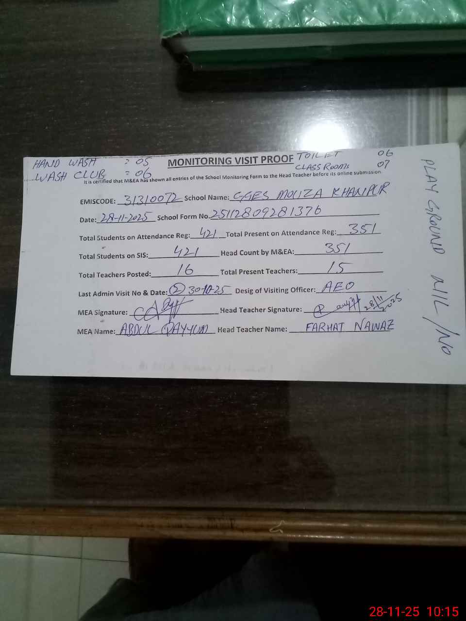 | Attendance Register | Head Teacher | MEA with School | Visit Proof |