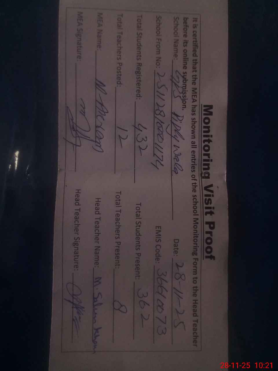 | Attendance Register | Head Teacher | MEA with School | Visit Proof |