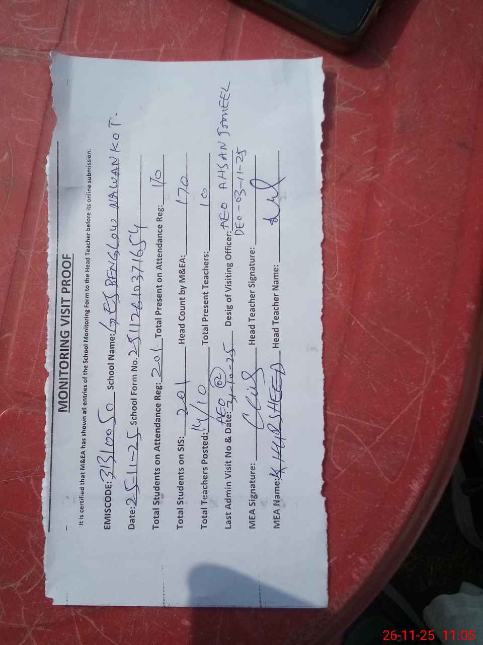 | Attendance Register | Head Teacher | MEA with School | Visit Proof |
