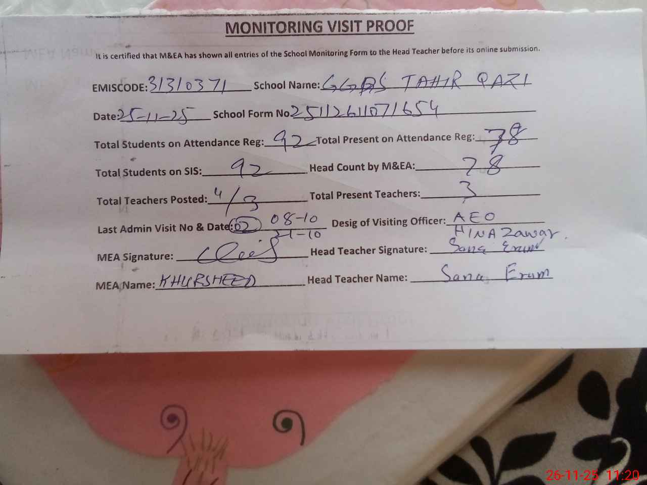 | Attendance Register | Head Teacher | MEA with School | Visit Proof |