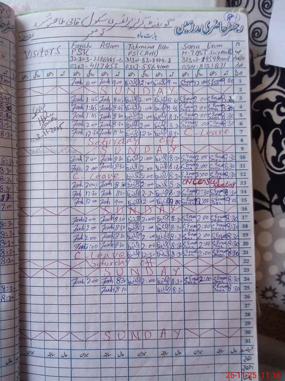 | Leave | Duty | Absent | Maternity | Medical | Ex- Pak |