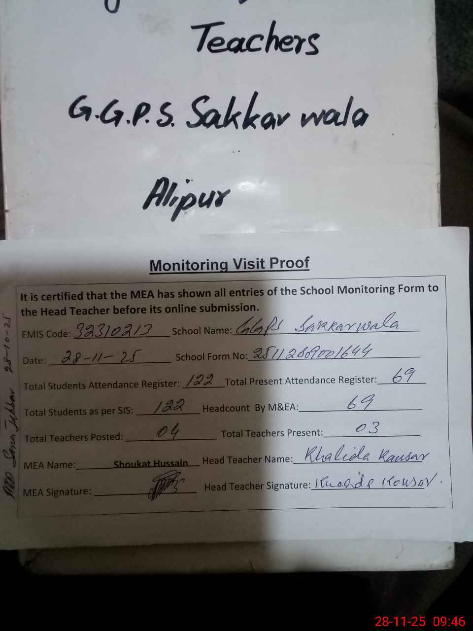 | Attendance Register | Head Teacher | MEA with School | Visit Proof |