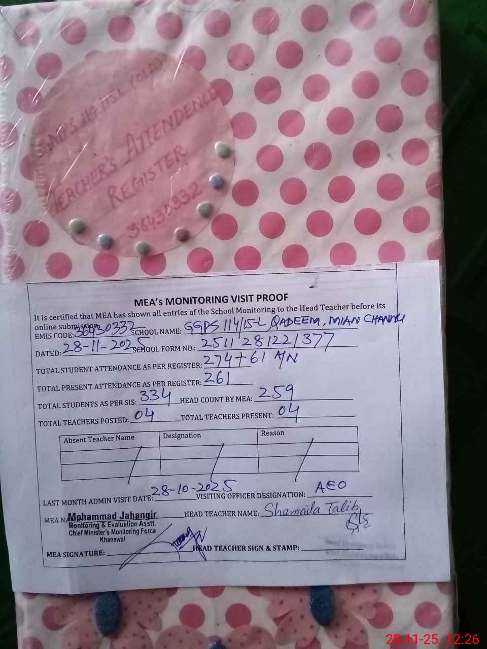 | Attendance Register | Head Teacher | MEA with School | Visit Proof |