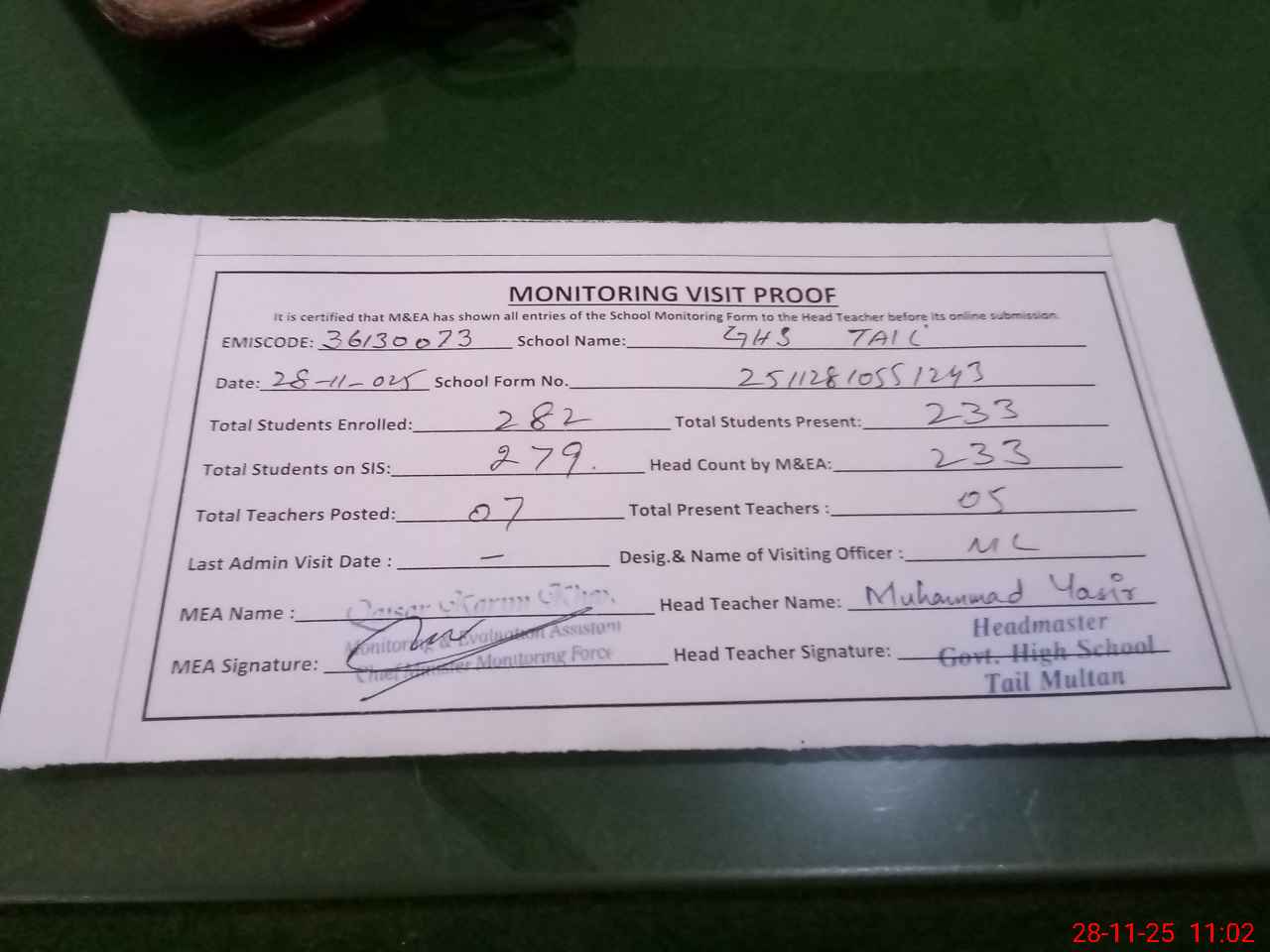 | Attendance Register | Head Teacher | MEA with School | Visit Proof |