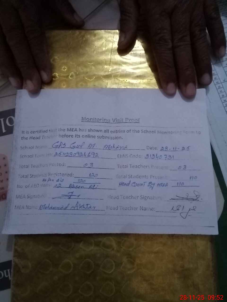 | Attendance Register | Head Teacher | MEA with School | Visit Proof |