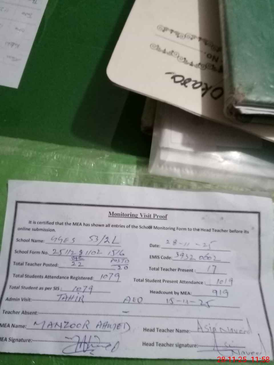 | Attendance Register | Head Teacher | MEA with School | Visit Proof |