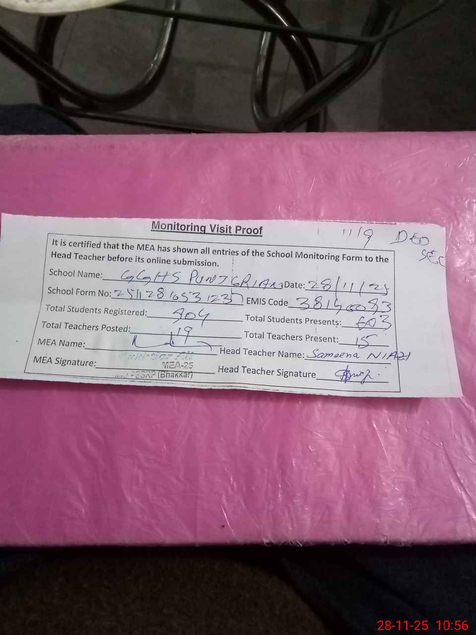 | Attendance Register | Head Teacher | MEA with School | Visit Proof |
