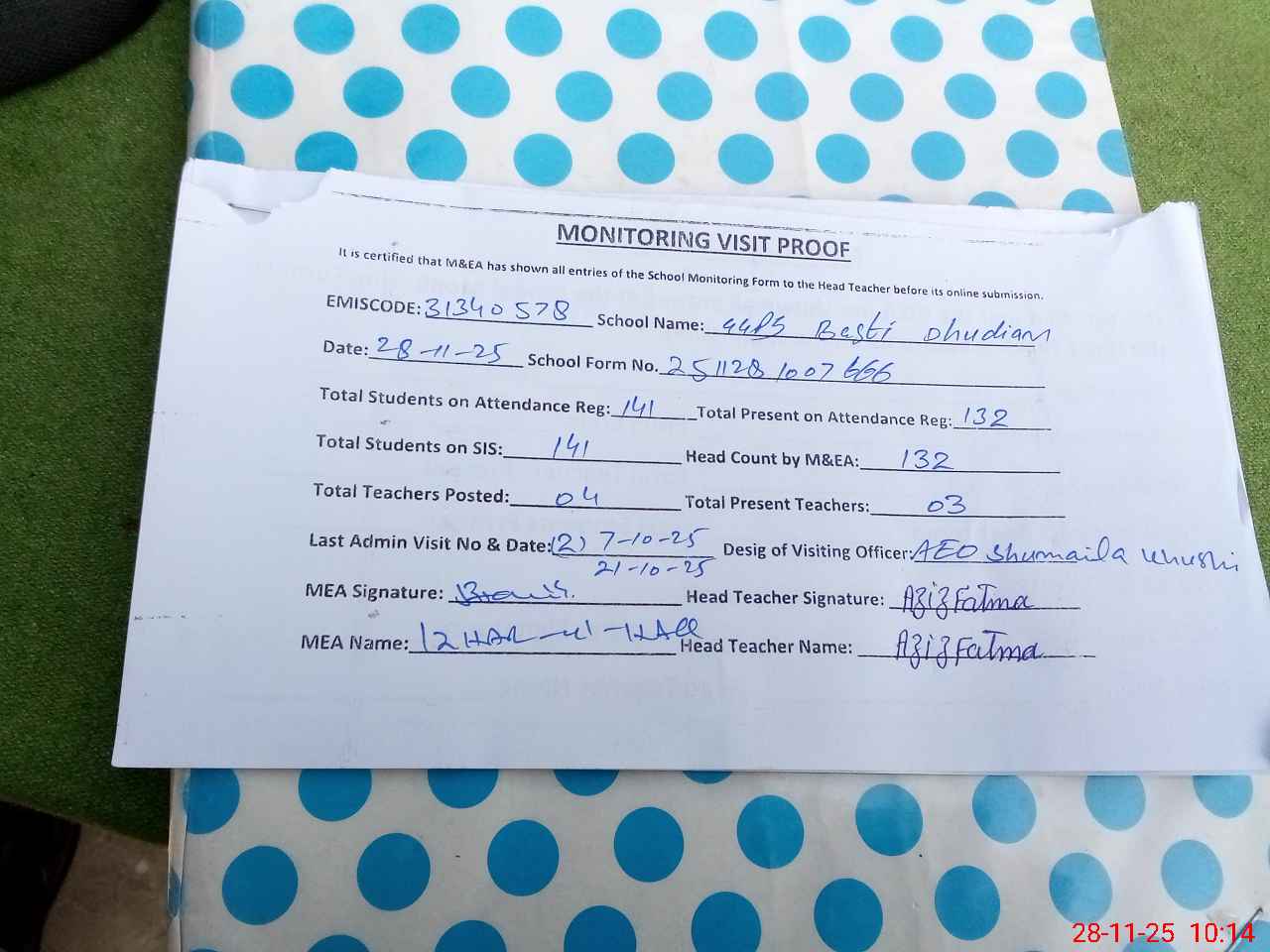 | Attendance Register | Head Teacher | MEA with School | Visit Proof |