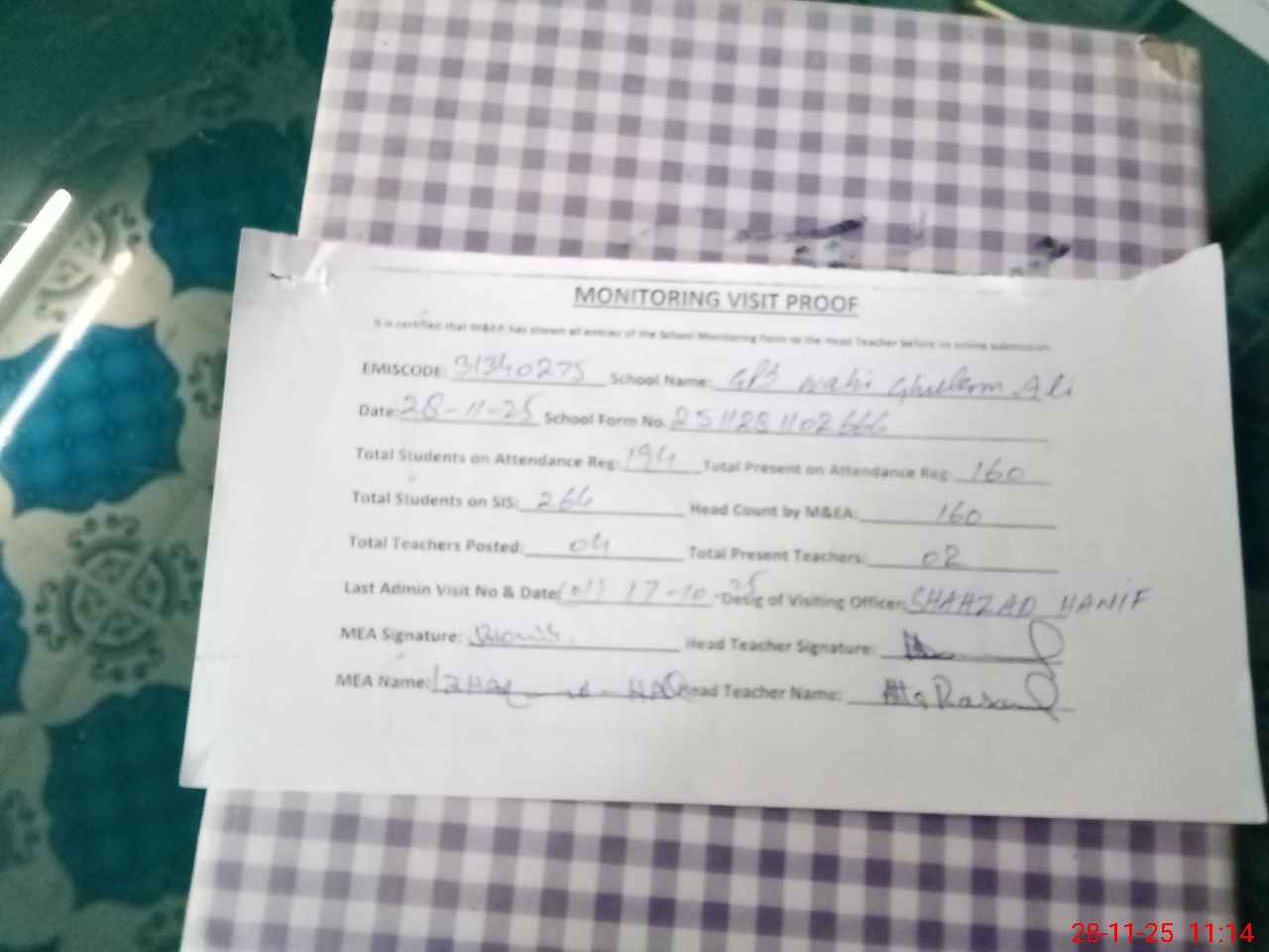 | Attendance Register | Head Teacher | MEA with School | Visit Proof |