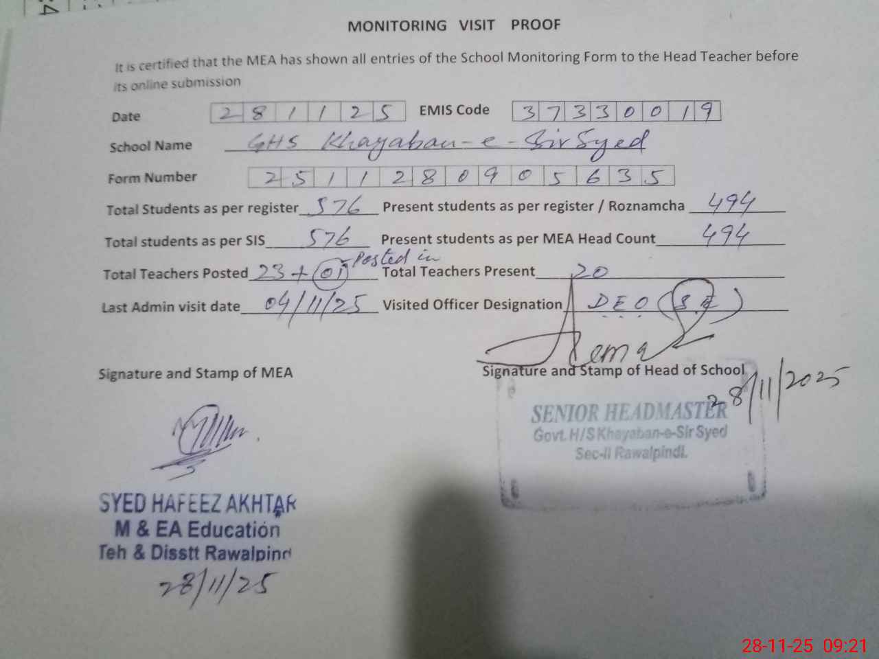 | EMIS Code: 37330019 | Name of School: GHS KHAYABAN-E-SIR SYED | |||