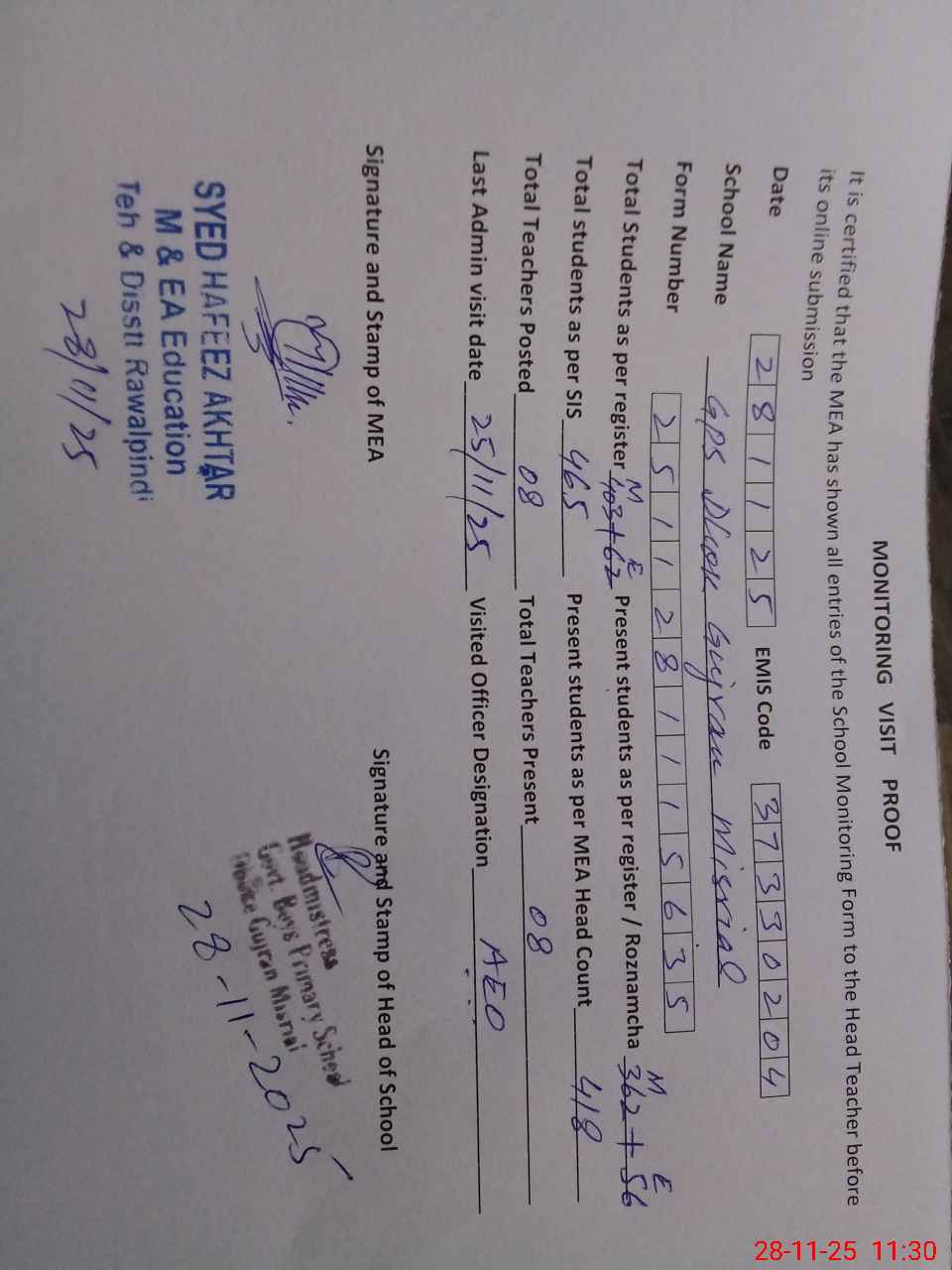 | Certified that this School was Inspected by the Undersigned MEA/DMO Today and the Information Stated Above is as Per Record. | |||||