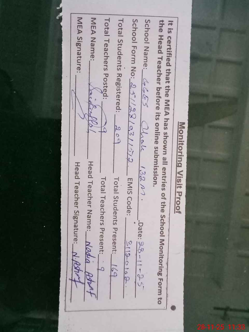 | Attendance Register | Head Teacher | MEA with School | Visit Proof |