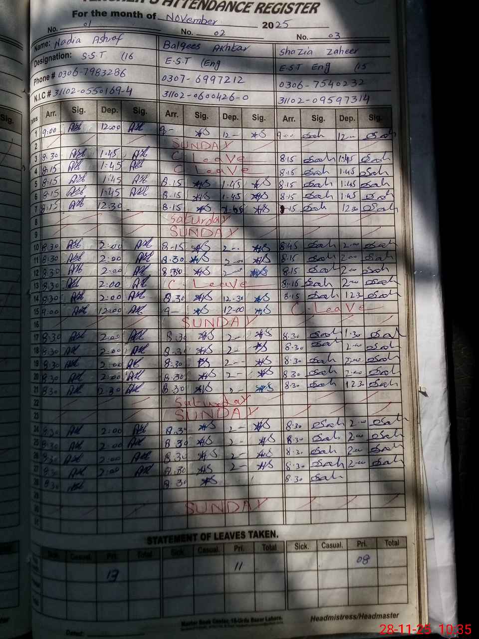 | CNIC | Full Name | Designation | R/C | Absence during last cal. month |