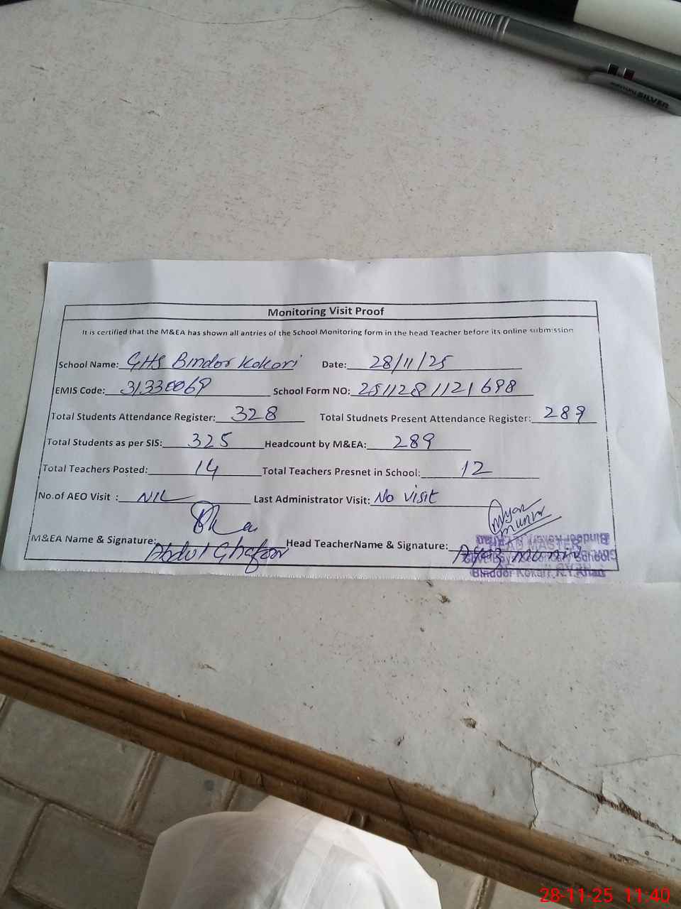 | EMIS Code: 31330069 | Name of School: GHS BINDOOR KOKARI | |||