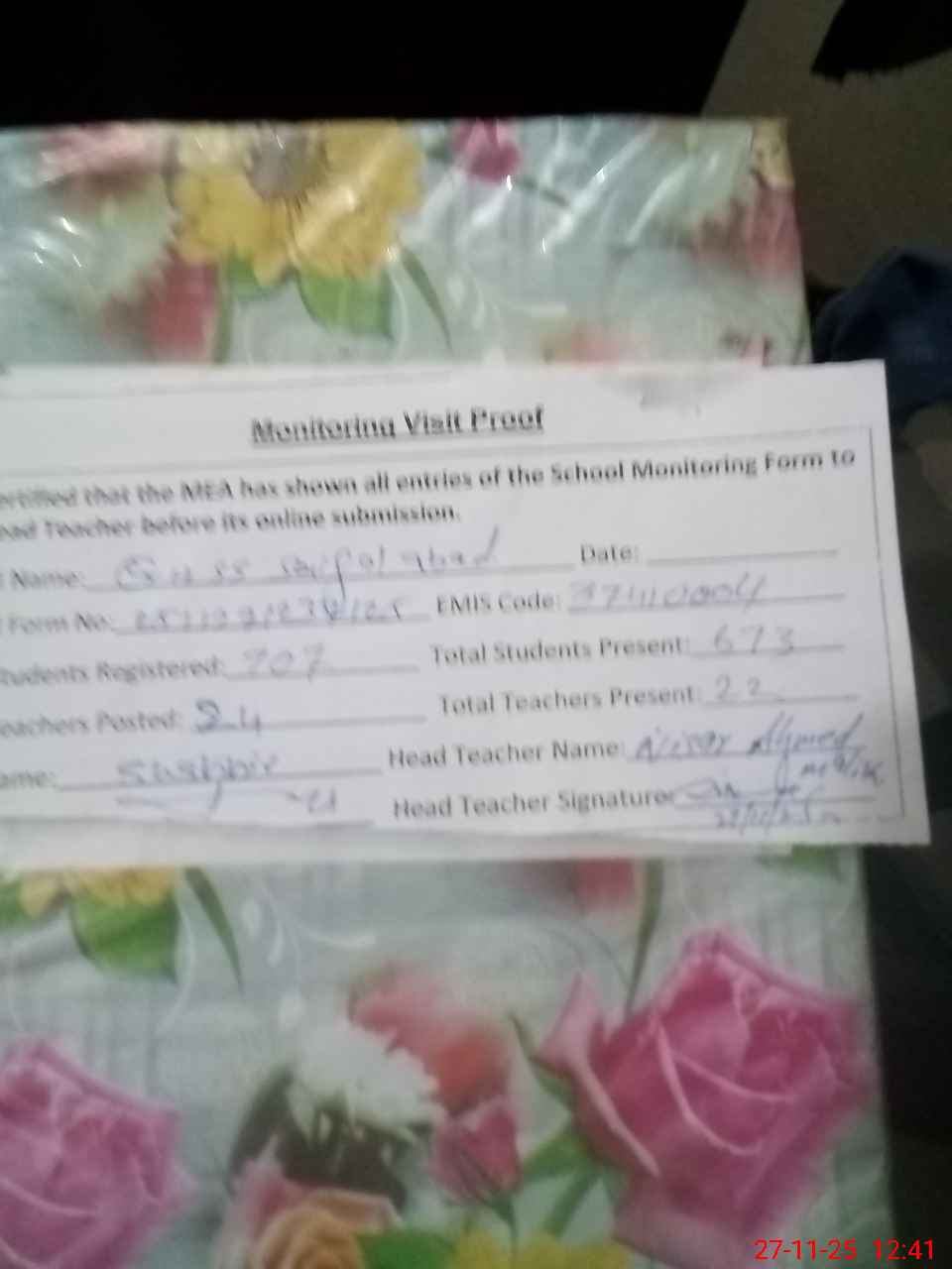 | Name: Ma**** Af**** Ah**** Designation: (School Headmaster's/Headmistress's) In charge Principal Phone/Cell Number: 03**** |